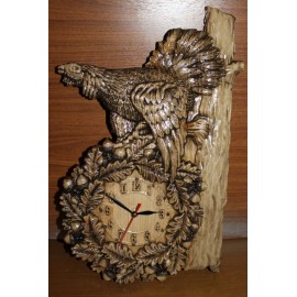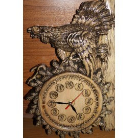 Часы настенные " Глухарь" 2-й вариант .Есть в наличии. Работа выполнена из сосны, покрыта защитным грунтом, патиной, лаком. Размер 40,5х28х3,5 см. цена 1800 руб. Возможно выполнение работы в другом размере...